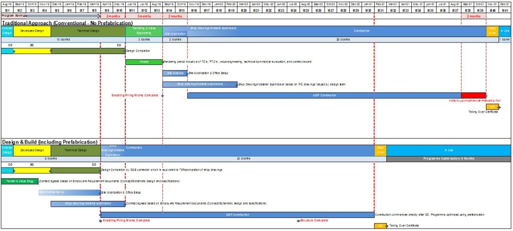 This is achieved by incorporating accelerated construction techniques that traditional designers will not implement (such as but not limited to – offsite prefabrications of services, single model (draw once) approach … etc.).
